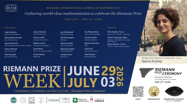 Twenty distinguished mathematicians from Princeton, ETH Zurich, IHES, NYU, EPFL and Sorbonne for a series of high-level invited lectures, a special Leonardo da Vinci Lecture at the Istituto Lombardo in Milan, and the delivery of the Riemann Prize to Sylvia Serfaty during the ceremony at Salone Estense in Varese.
